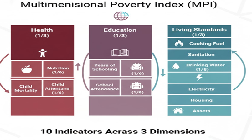 ग्लोबल मल्टीडाइमेंशनल पॉवर्टी इंडेक्स (MPI) गरीबी का एक व्यापक दृष्टिकोण प्रस्तुत करता है, जो आय से परे जाकर स्वास्थ्य, शिक्षा और जीवन स्तर में गंभीर अभावों को मापता है।