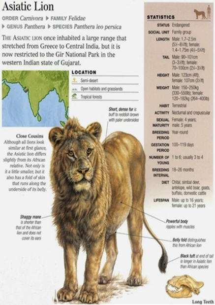 • भारतीय शेर मुख्य रूप से गुजरात के गिर राष्ट्रीय उद्यान में पाए जाते हैं।