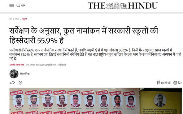 - इसके विपरीत, शहरी क्षेत्रों में केवल 30.1% छात्र ही सरकारी स्कूलों में नामांकित हैं, क्योंकि वहां निजी स्कूलों की उपलब्धता और पसंद दोनों अधिक है।